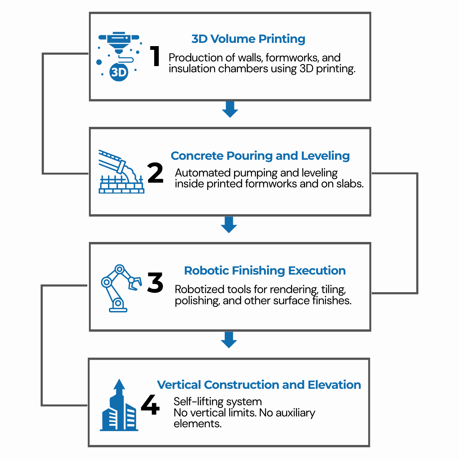 Exclusive patented geometry and movement that allows reaching all spaces of the previously printed construction to automate the construction phases.