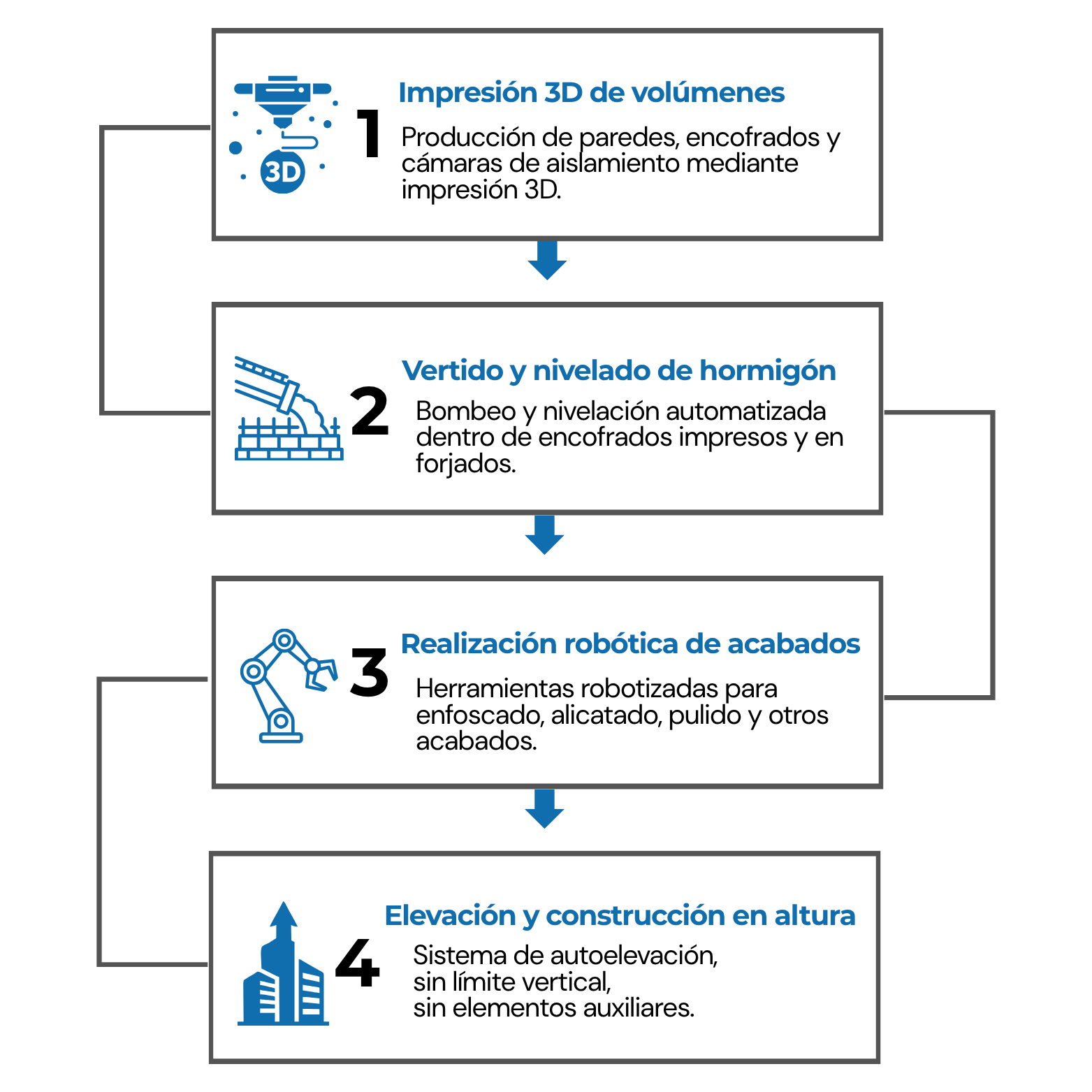 Tecnología única que posibilita la construcción de estructuras sin límite de altura, adaptándose al crecimiento del edificio.